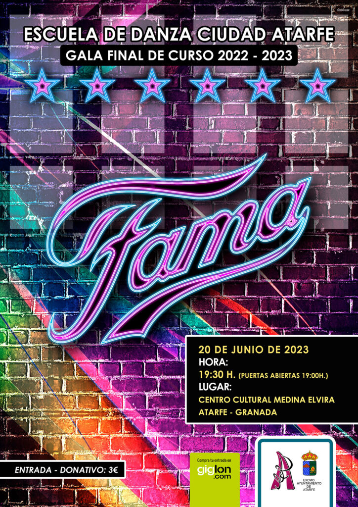 La Escuela de Danza Ciudad Atarfe vuelve con «FAMA» en la gala final de curso 2022-2023. El próximo día 20 de Junio de 2023 a las 19:30h (apertura de puertas a las 19:00) tendremos de nuevo la oportunidad de disfrutar del espectáculo que ofrecieron nuestros alumnos/as el año pasado y que por petición popular, vuelve este año con muchas novedades. Se trata de hacer un guiño a la mítica película «FAMA» pero con la intervención de los diferentes grupos y estilos que se ofrecen en nuestro centro. ¡Os esperamos!